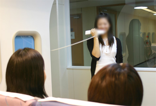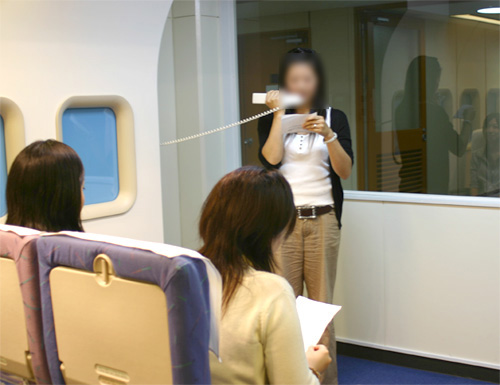マイクのスイッチを入れると「ポーン」と音が鳴り本物の機内アナウンスの臨場感そのもの! まずは、カンニングペーパーを見ながらの練習。自分の声をマイクを通して聞くとちょっと変な感じ....